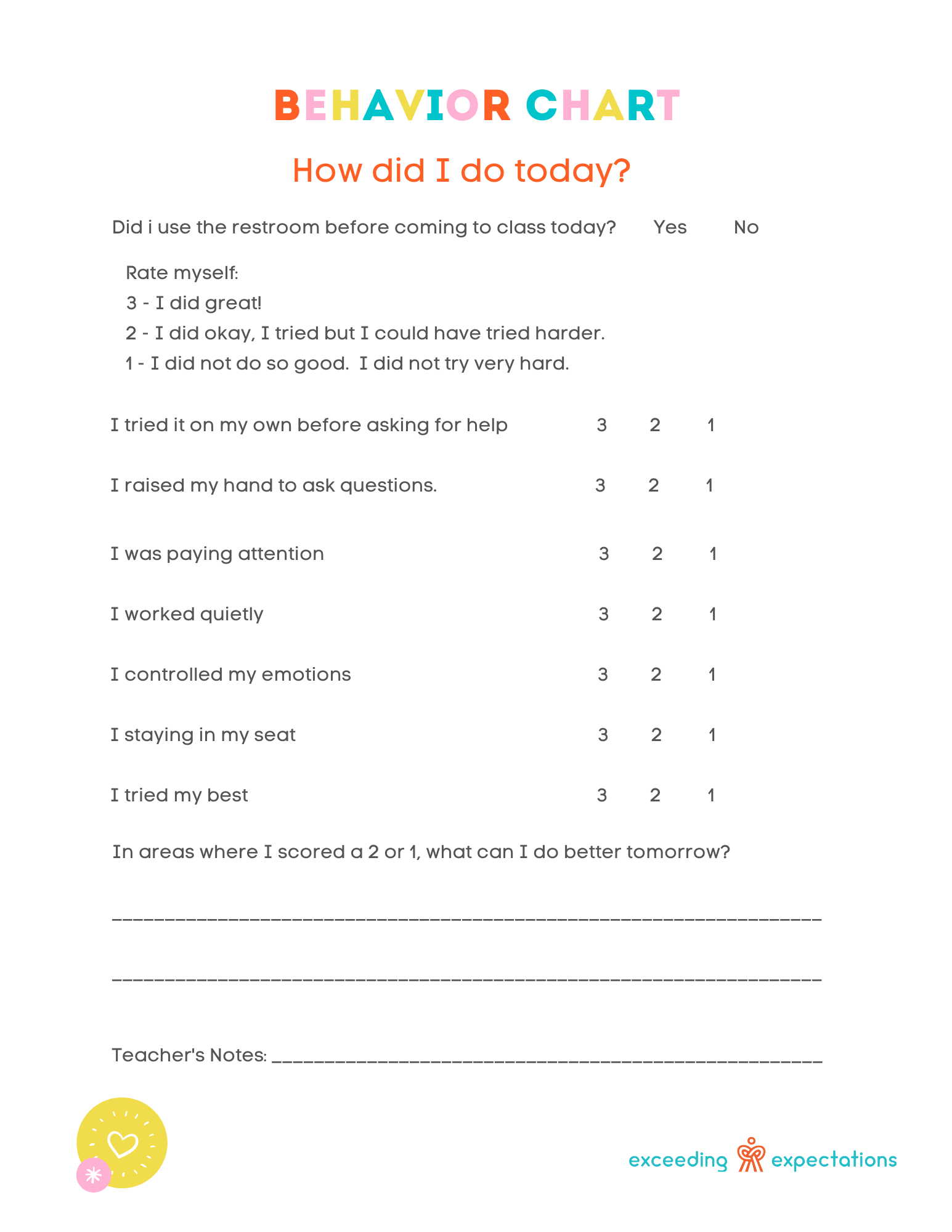 Self regulation is an important part of development for children with mild to moderate disabilities. Download this behavior chart to get your child analyzing their behavior at the start and end of each day!